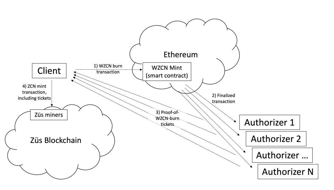 Similarly, when a proof-of-ZCN-burn ticket from the authorizer is included in a call to the WZCN smart contract, the authorizers are paid in ether by the WZCN mint smart contract. Again, the amount of these transaction fees are specified in the smart contract and non-negotiable.&#x20;
