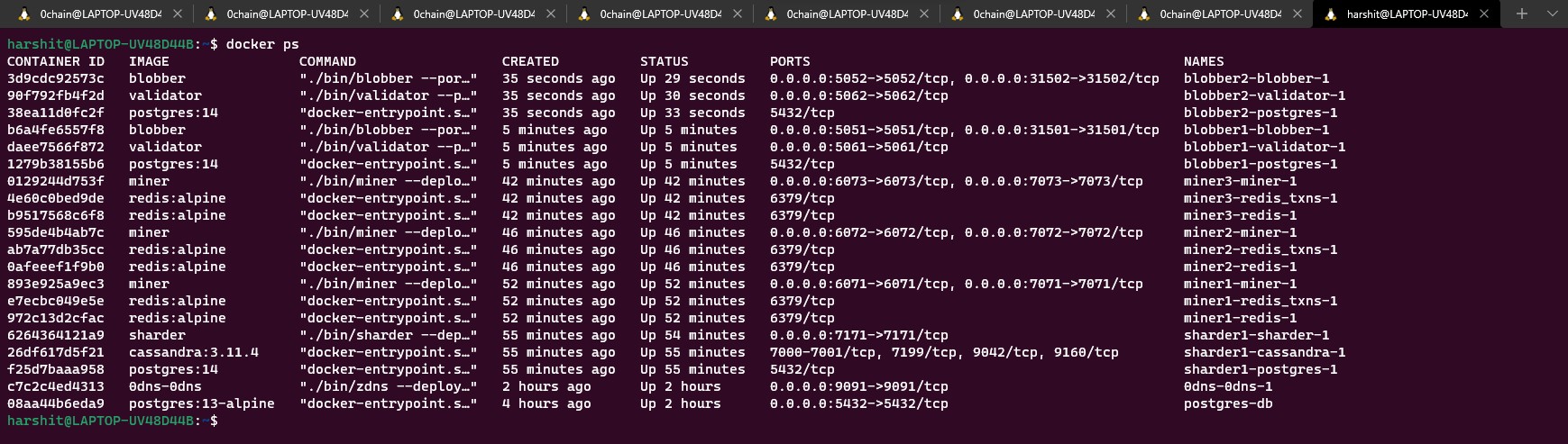<figure><img src="https://979598987-files.gitbook.io/~/files/v0/b/gitbook-x-prod.appspot.com/o/spaces%2FNrAZJ0KGiwEbKkbVRYPu%2Fuploads%2FhOgtGObrRgsqGWzWlJVr%2Fdocker%20ps.jpg?alt=media&#x26;token=24be440e-de92-4225-8d7b-aecada3d3287" alt=""><figcaption><p>Docker ps output</p></figcaption></figure>
