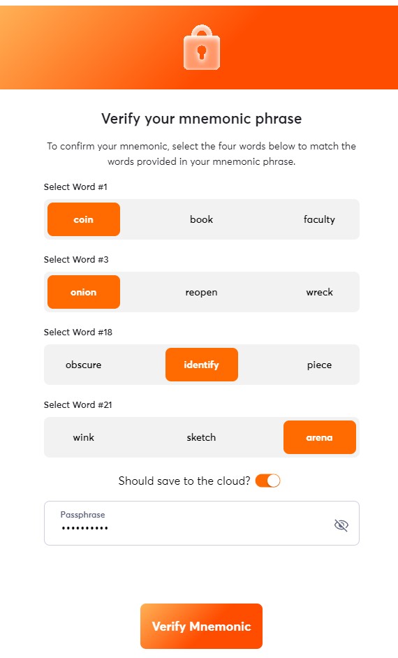 5. Verify your mnemonic phrase, enable the option to save it securely to the cloud with a passphrase, and click "Verify Mnemonic." See screenshot below for reference: