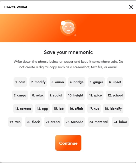 4. Make sure to securely save your mnemonic phrase, and then click "Continue."